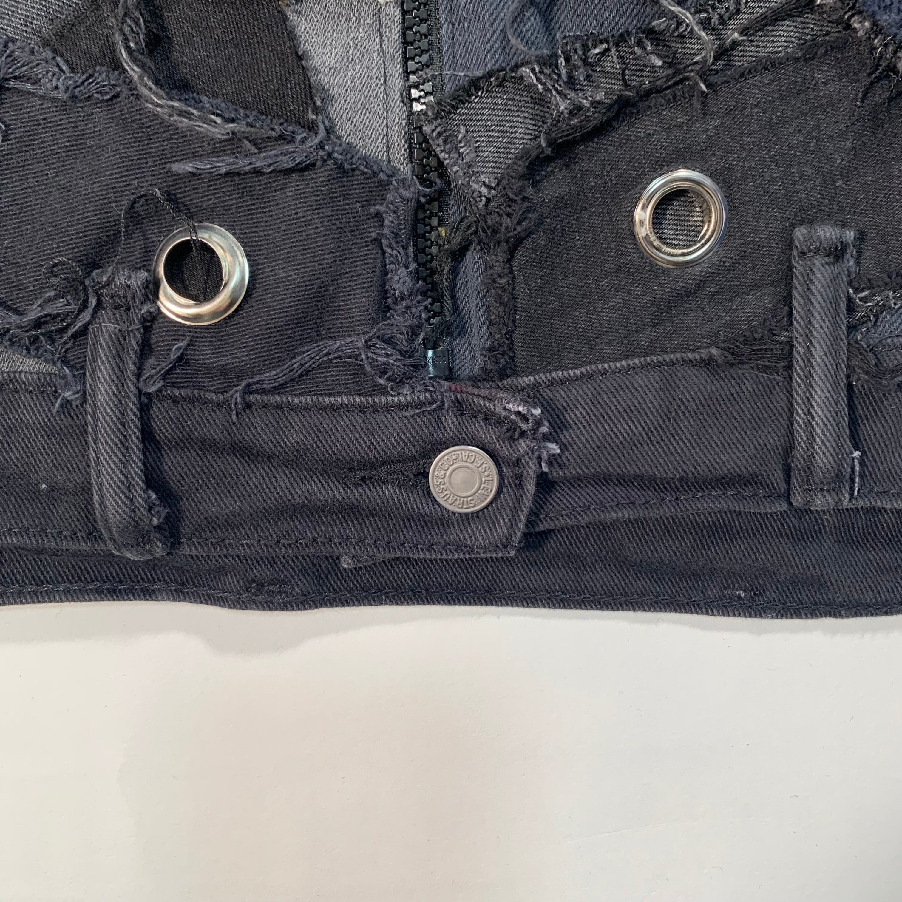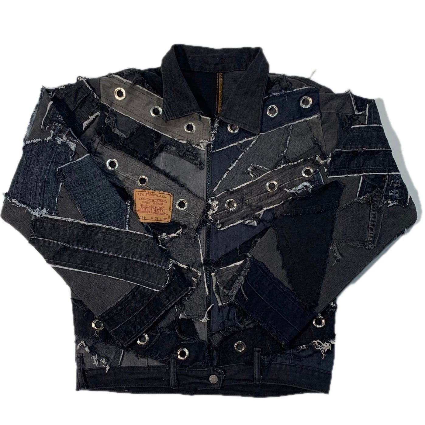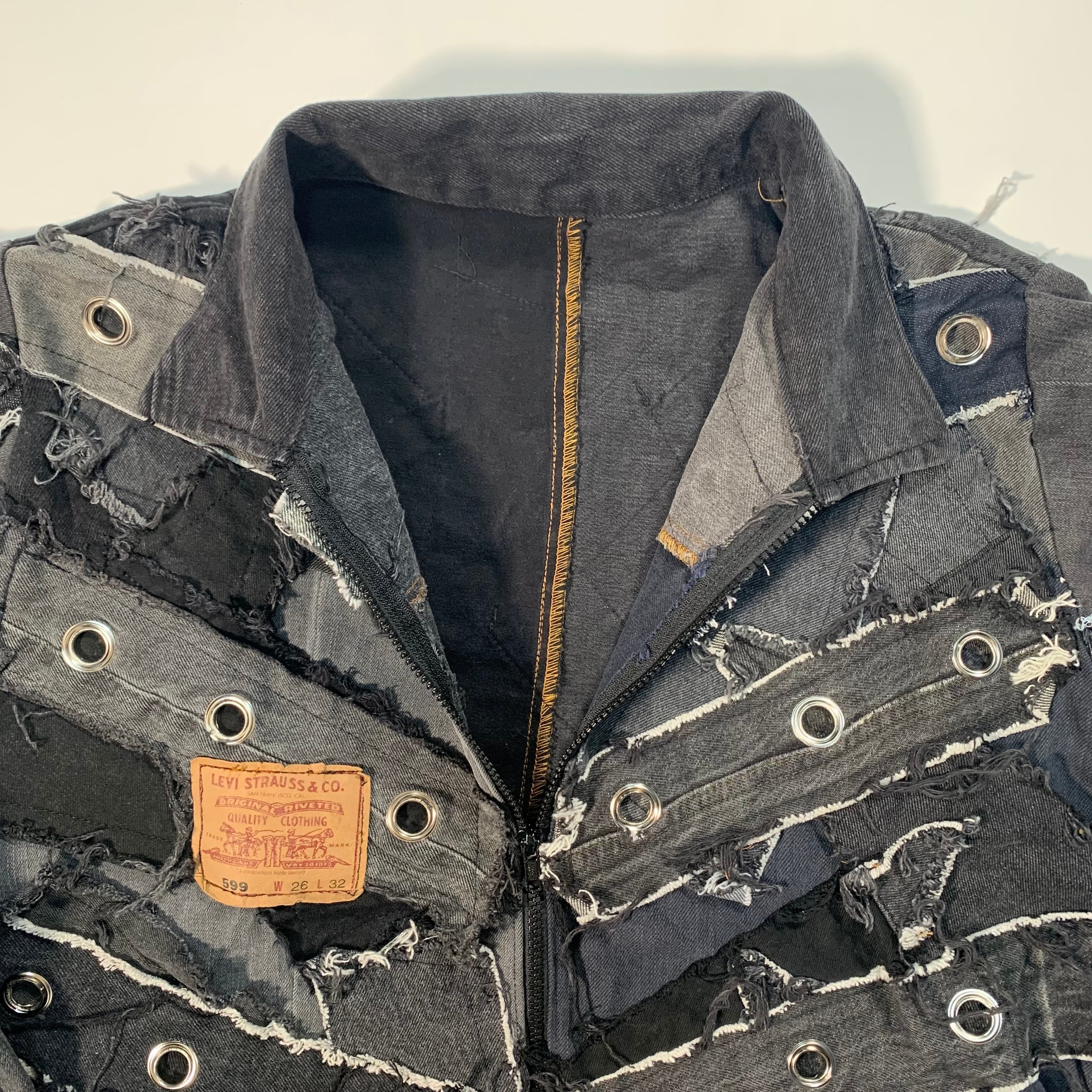 ユニークなパッチワークデザインのブラックデニムジャケット。