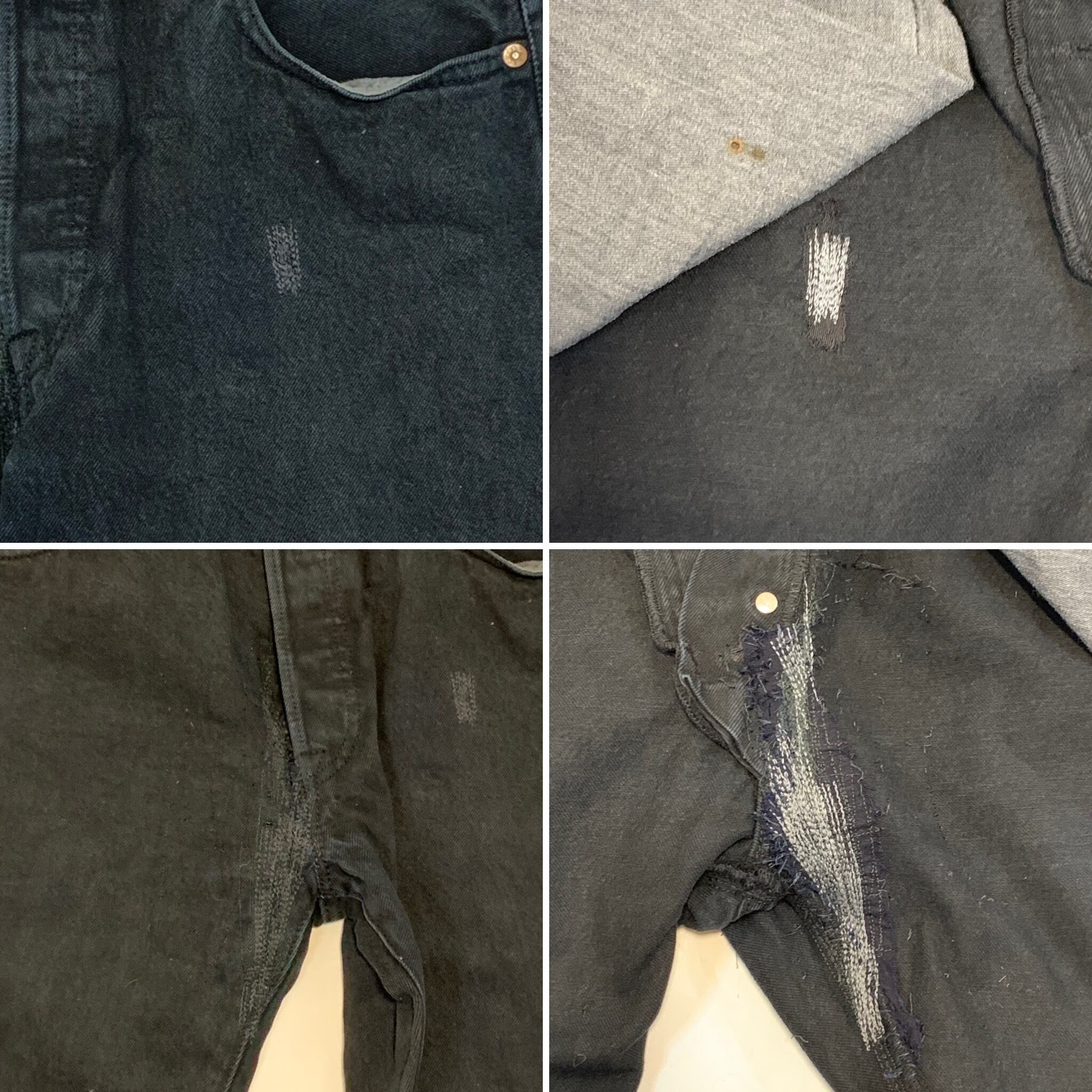 フロント左腿のポケット下と、ボタンフライから股下にかけてリペア跡、